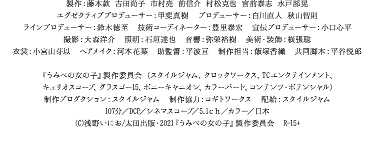 原作:浅野いにお「うみべの女の子」 監督・脚本・編集:ウエダアツシ 音楽:world‘s end girlfriend 挿入曲:はっぴいえんど「風をあつめて」